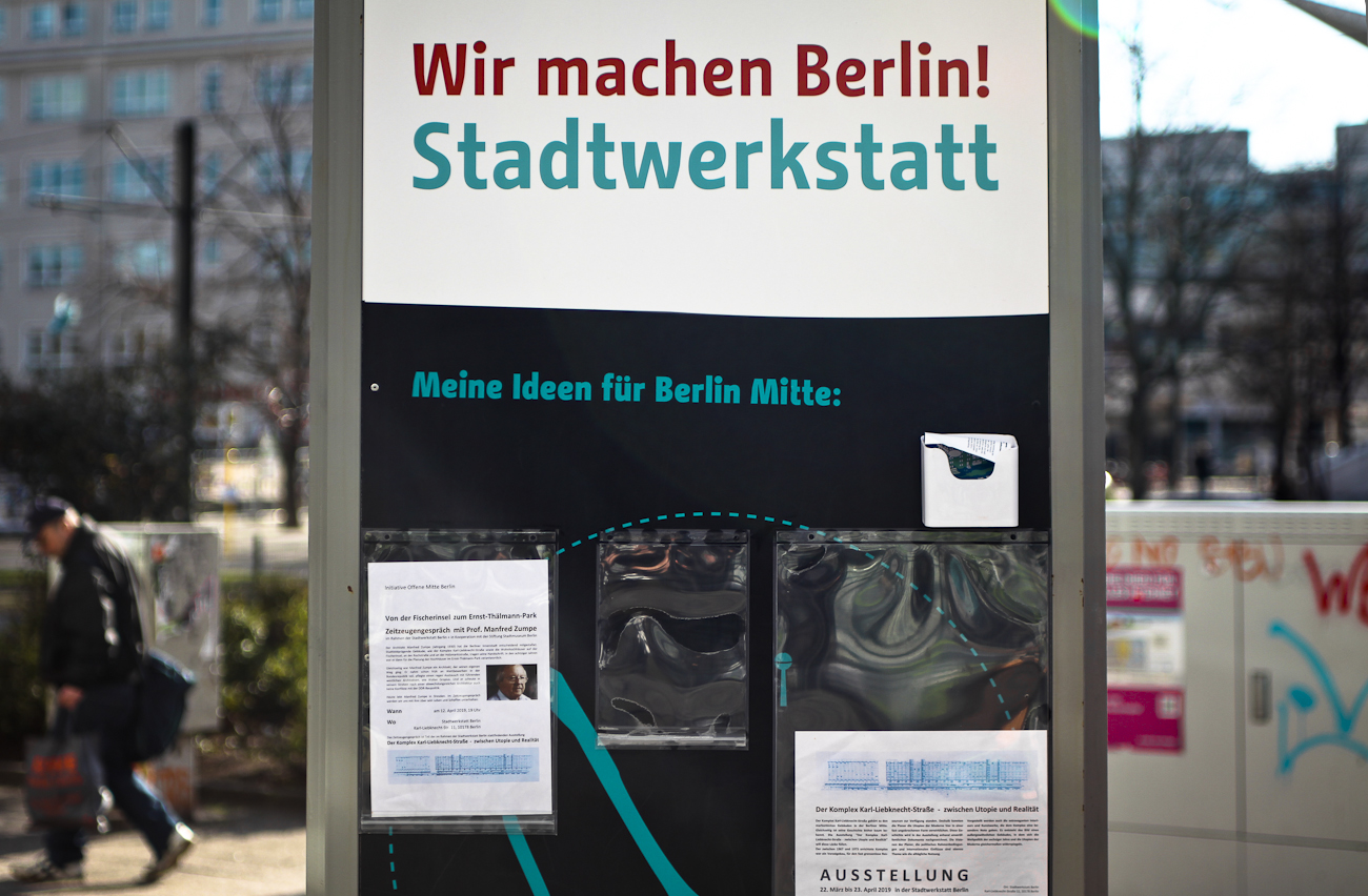 The Stadtwerkstatt (linked page is only in german language) is an instrument of citizen participation for the historic city-centre of Berlin.